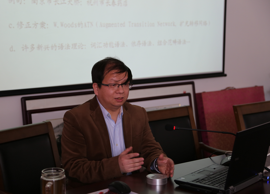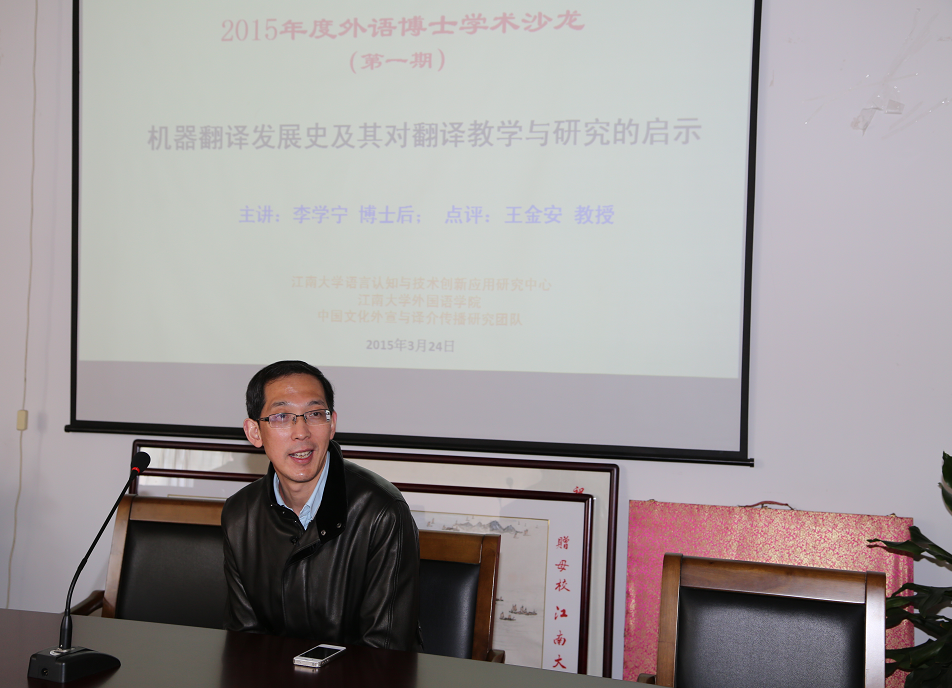 隨后,李學寧博士做了“機器翻譯發展史及其對翻譯教學與研究的啟示”的主題講座。李博士從索緒爾《普通語言學教程》的歷史意義與數學之于語言研究的重要性談起,借鑒語言學、數學、計算機科學甚至哲學的思想與成果來系統尋蹤并客觀分析了機器翻譯的發展階段、主要人物、重要概念、本質屬性、翻譯標準、課程開設、市場開發以及對翻譯教學與研究的啟示。李博士的講解深入淺出、旁征博引、講解風趣、舉例生動,受到了參與者的一致好評。在老師們和李博士進行了簡短的互動后,王金安教授以其開闊的學術視野、深厚的理論功底與精辟的語言文字對李博士的講解與該場學術沙龍進行了精彩點評。沙龍最后在老師們的自由交流中落幕。