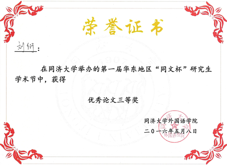 2016年5月8日,第一屆華東地區“同文杯”研究生學術節在同濟大學外國語學院同文樓隆重舉行。來自全國26所高校的上百名研究生濟濟一堂、共饗學術盛宴,圍繞“國際視野與中國語境觀照下的外國語言文學研究”這一主題,在語言學、文學和翻譯等研究領域進行了充分交流。本次學術節共收到來自北京大學、中國人民大學、復旦大學、同濟大學、中南大學、華東師范大學、上海外國語大學以及js3333線路檢測中心等26所高校的博士和碩士研究生投稿論文105篇。我院方文開教授指導的2014級碩士研究生劉衍攜論文參加了此次學術節。