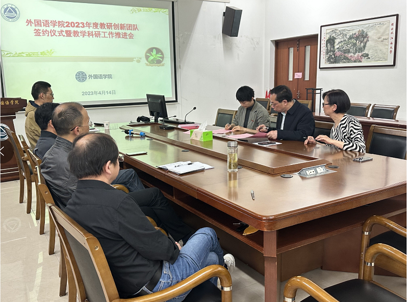 學(xué)院從學(xué)科建設(shè)和教學(xué)質(zhì)量的現(xiàn)實(shí)需求和發(fā)展目標(biāo)出發(fā),根據(jù)《外國語學(xué)院教學(xué)科研創(chuàng)新團(tuán)隊(duì)建設(shè)與考核管理辦法(2023年修訂)》,依照教授申報(bào)團(tuán)隊(duì)組建意向、教師個(gè)人自愿申報(bào)、最終組建團(tuán)隊(duì)的流程,組建今年的教學(xué)創(chuàng)新團(tuán)隊(duì)。4月14日下午,外國語學(xué)院隆重舉行2023年度教研創(chuàng)新團(tuán)隊(duì)簽約儀式暨教學(xué)科研工作推進(jìn)會(huì)。