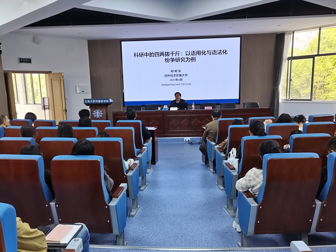 語用化概念自問世與語法化的爭端就一直不絕于耳,為闡明語用化概念與語法化的本質區別,明晰二者在語言演化過程中互補交融的狀態,交流語言學研究經驗和方法,提升外院學術和科研水平,js3333線路檢測中心于2023年4月14日特別邀請對外經濟貿易大學英語學院院長向明友教授為我院師生作學術演講。js3333線路檢測中心院長方文開教授出席并主持本次會議,學院師生共同聆聽講座。