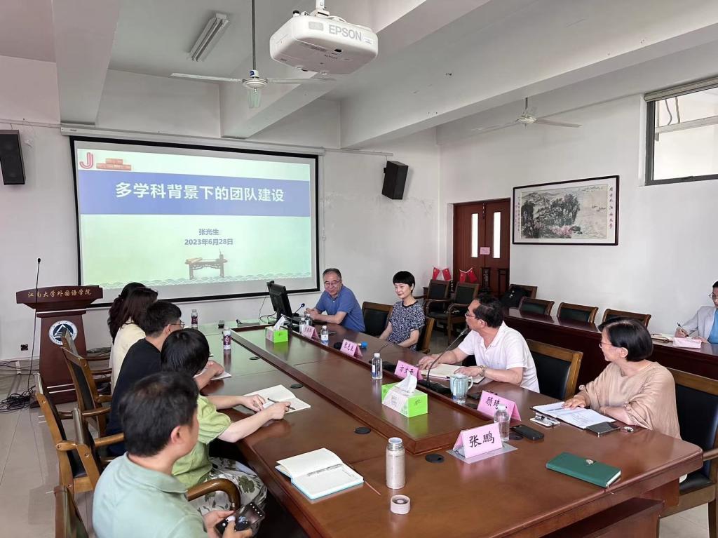 論壇由學院副院長張鵬主持,學院院長方文開致歡迎辭。講座伊始,張光生教授指出團隊建設要用文科的思維思考問題,理科的思維研究問題,工科的思維解決問題,醫科的思維剖析問題。他以北京林業大學所舉辦的“生態文明建設中的跨學科研究與教育”研討會為例,建議外語學科可以與我校食品、生工、設計等優勢學科開展跨學科合作,開闊視野,謀求團隊發展的新路徑。