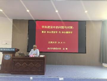 2024年4月11日下午,四川外國語大學(xué)資深教授、博士生導(dǎo)師王寅教授為我院師生作了題為“體認(rèn)語言學(xué)與體認(rèn)翻譯學(xué)”的學(xué)術(shù)講座。講座由外國語學(xué)院院長方文開教授主持,學(xué)院全體教師、研究生參加了本次講座。