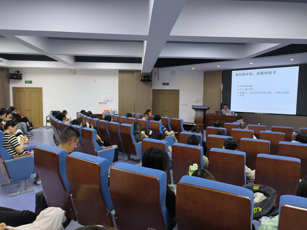 隨后,查明建教授圍繞“何為文學經典”“為何要讀文學經典”以及“如何從文學經典閱讀中培養審美能力”三個問題對文學經典作品在審美教育中的作用進行了深入的解讀。他首先解釋了文學經典的定義,闡述了閱讀文學經典的重要性,指出文學不僅能幫助人們向上向善,還能讓我們更深入地了解人性,洗滌靈魂。在談到如何從文學經典閱讀中培養審美意識時,查明建教授旁征博引中外名著,不僅讓在場師生領略了大師風范,同時也展示了經典文學作品經久不衰的魅力。查明建教授強調,文學并不是與我們生活無關的一門學科,而是深深植根于我們日常生活之中,是人工智能時代背景下培養人文精神和審美能力不可或缺的重要渠道。