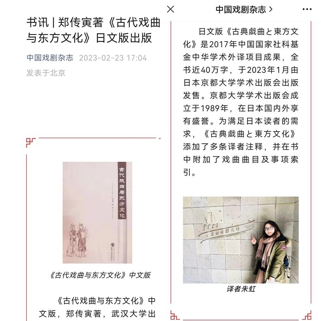 《古代戲曲與東方文化》中文版,鄭傳寅(武漢大學(xué)藝術(shù)學(xué)院二級教授)著,國家社科基金項目最終成果,國家“十一五”重點規(guī)劃選題,是系統(tǒng)考查中國古代戲曲和東方文化關(guān)系的學(xué)術(shù)專著。該著作將中國古代戲曲置于東方文化的宏闊背景之下進(jìn)行觀照,在與日本、越南、朝鮮半島傳統(tǒng)戲劇的比較中概括中國古代戲曲的特點,發(fā)掘其東方文化蘊涵。《古典戯曲と東方文化》是其日譯版,也是2017年國家社科基金中華學(xué)術(shù)外譯的項目成果。日文譯本近40萬字,譯者在原著的基礎(chǔ)上進(jìn)行了適量刪減和部分修正。由于書中引用了大量古代戲曲唱詞,讀起來頗為晦澀難懂,為了滿足日本廣大戲曲愛好者的需求,譯者在翻譯過程中添加了諸多名詞概念注釋,并在書中附加了戲曲曲目及事項索引,具有較強的普適性及可讀性。該譯著于2023年1月由京都大學(xué)學(xué)術(shù)出版會正式出版發(fā)售。京都大學(xué)學(xué)術(shù)出版會成立于1989年,隸屬日本國內(nèi)最高學(xué)府之一的京都大學(xué),依靠本校雄厚的教學(xué)和科研力量,出版了大量高水平、高質(zhì)量、適應(yīng)多層次需要的人文社科類專業(yè)書籍,在日本國內(nèi)外享有盛譽。