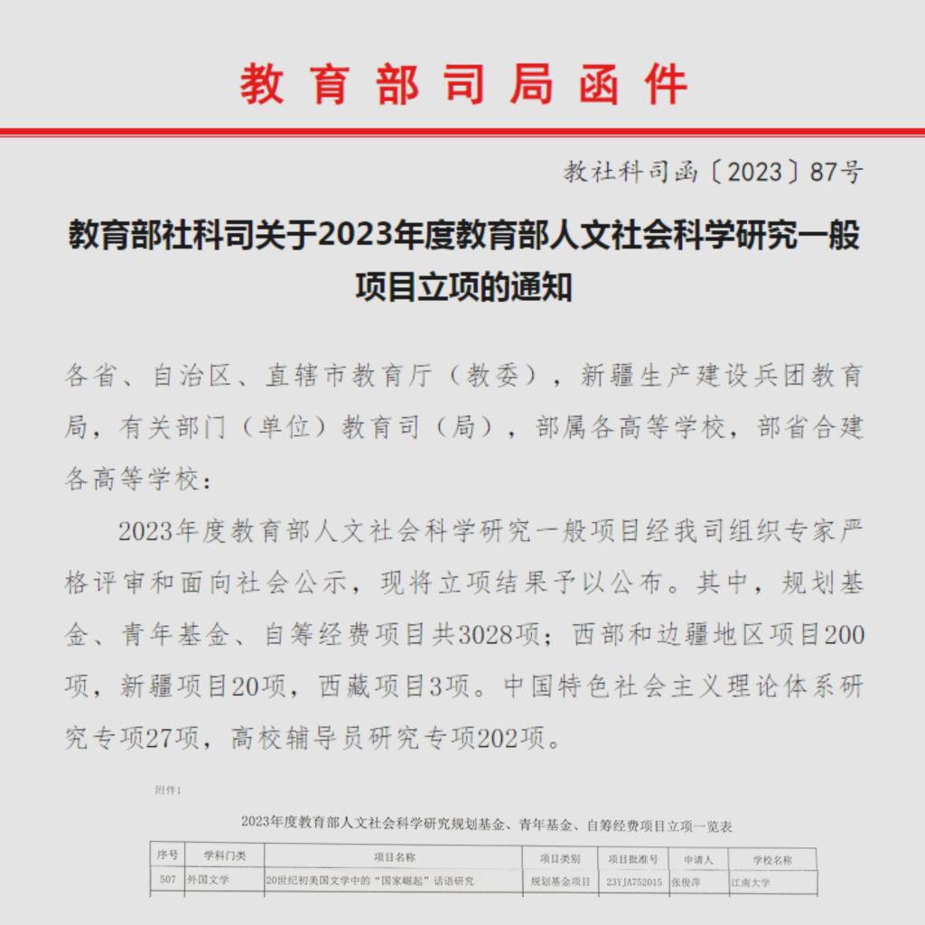 近日,教育部社科司發布了《關于2023年度教育部人文社會科學研究一般項目立項的通知》(教社科司函〔2023〕87號)。我院張俊萍教授主持的項目《20世紀初美國文學中的“國家崛起”話語研究》成功獲得規劃基金立項。該項目課題試圖從新的視角對20世紀初的美國文學提出一系列新的認識,有助于我們深度理解和應對進入后崛起時代的當下美國,并有助于啟發我們進一步思考中華民族偉大復興的戰略和策略。