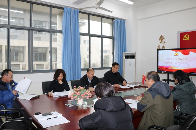 根據《關于開好2022年度黨員中層干部黨民主生活會的通知》(江大委〔2023〕2號)要求,2月13日下午,外國語學院召開了2022年度黨員中層干部民主生活會。校黨委督導、校黨委常委、副校長顧正彪同志,校紀委督導、校紀委委員、理學院黨委書記王玨同志來院督查指導。學院黨委書記史志洪主持會議。