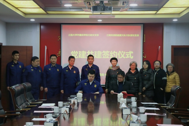 參觀結束后,外國語學院行政黨支部書記季王飛、江陰市消防救援大隊大隊部黨支部書記陳俊宏簽署黨建共建協議。黨支部雙方成員共同開展學習習近平同志《論教育》,習近平同志關于總體國家安全觀的重要論述。