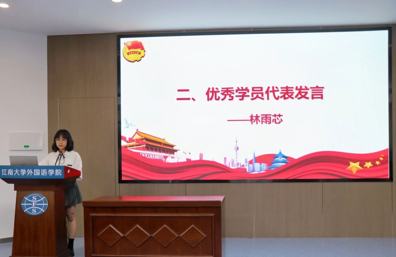 優秀學員代表林雨芯同學發言。她表示無論是專題講座、素質拓展、還是校外參觀,青馬訓練營期間的每一次經歷都讓她受益匪淺,她深刻地領悟了馬克思主義的真諦、堅定了共產主義的信仰、明確了前進的方向。此外,她還引用宋蘇鳳老師在第二講中說到的話“外語人要有理想、敢擔當、能吃苦、肯奮斗、扣好人生第一粒扣子”,希望新時代的外語人都能保持初心和對中華文化的熱愛和尊重,培養國際視野和理論自信,向世界傳遞中國聲音。