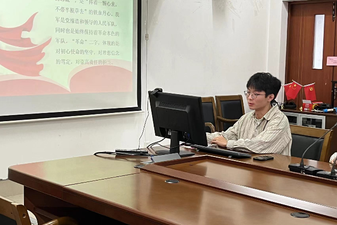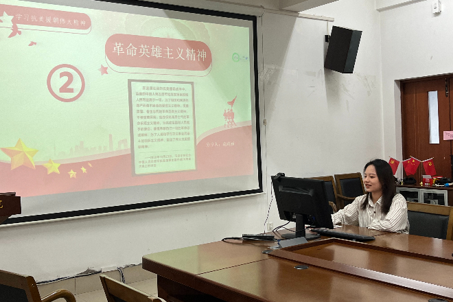座談會(huì)正式開(kāi)始,三位黨支部成員輪流為學(xué)生們介紹抗美援朝偉大精神。羅品輝同學(xué)首先簡(jiǎn)要介紹了抗美援朝精神的內(nèi)涵,即愛(ài)國(guó)主義精神、革命英雄主義精神、革命樂(lè)觀主義精神、革命忠誠(chéng)精神和國(guó)際主義精神。隨后,她就愛(ài)國(guó)主義精神展開(kāi)詳細(xì)闡述,圍繞“什么是愛(ài)國(guó)主義精神”和“如何弘揚(yáng)愛(ài)國(guó)主義精神”兩大基本問(wèn)題帶領(lǐng)同學(xué)們學(xué)習(xí)愛(ài)國(guó)主義精神并結(jié)合前國(guó)家總理李克強(qiáng)的講話視頻及當(dāng)下流行短劇《逃出大英博物館》引導(dǎo)同學(xué)們感悟愛(ài)國(guó)主義精神。最后她號(hào)召大家弘揚(yáng)愛(ài)國(guó)主義精神,構(gòu)筑中華民族共有精神家園。花靖涵同學(xué)帶領(lǐng)同學(xué)們領(lǐng)悟了英勇頑強(qiáng)、舍生忘死的革命英雄主義精神和不畏艱難困苦、始終保持高昂士氣的革命樂(lè)觀主義精神,并結(jié)合國(guó)家當(dāng)前形勢(shì),探討了如何將這兩個(gè)偉大精神應(yīng)用到社會(huì)實(shí)踐中去。張海熠同學(xué)則通過(guò)分享歷史小故事的方式介紹了革命忠誠(chéng)精神和國(guó)際主義精神。他總結(jié)道,革命忠誠(chéng)精神是抗美援朝精神的底蘊(yùn),是支撐起志愿軍將士革命英雄主義精神和革命樂(lè)觀主義精神的深層次因素;國(guó)際主義精神是抗美援朝精神的有機(jī)組成,是激勵(lì)中國(guó)人民志愿軍奔赴朝鮮戰(zhàn)場(chǎng)的重要?jiǎng)右颉?/p>