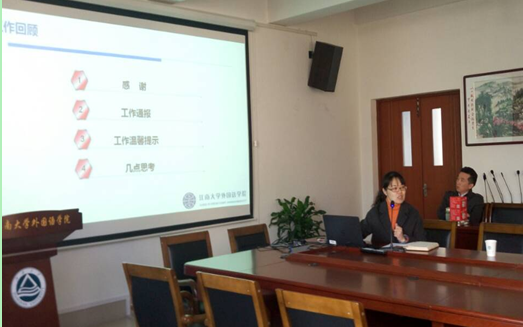 接著,趙副書記做了學院工作通報,三年來,我院逐步建立了SOL學分建設體系,樹立外院品牌,開展優秀班風展示活動,促進國際交流的發展。從本科畢業生就業情況來看,我院本科畢業生就業率逐年攀升,超過全校平均水平。就業競爭力指數也逐年上升,得到社會各界的肯定。從海外交流情況,我院本科生海外交換、游學人數逐年增加,在本校排名位居前列,但相較同級其他學校外院的情況來看,我院仍需繼續努力。從本科生專四、專八通過情況來看,我院專四、專八通過情況總體呈上升趨勢,其中以2015年最為突出,專四優秀率達到新的高度。