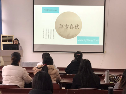 首先,由十名選手帶著自己的ppt進行自我展示。選手們結合活動主題,制作了精美的ppt對他們各自作品的創作靈感以及特色進行了介紹。有些選手以思鄉之情作為自己的寫作主題,而有些選手則是圍繞小女生對于愛情的雀躍之情做了刻畫。每種闡釋都令人眼前一亮,展現了我院學生出色的語言能力和創新精神。每個選手展示完成后,都會有評委老師進行點評。