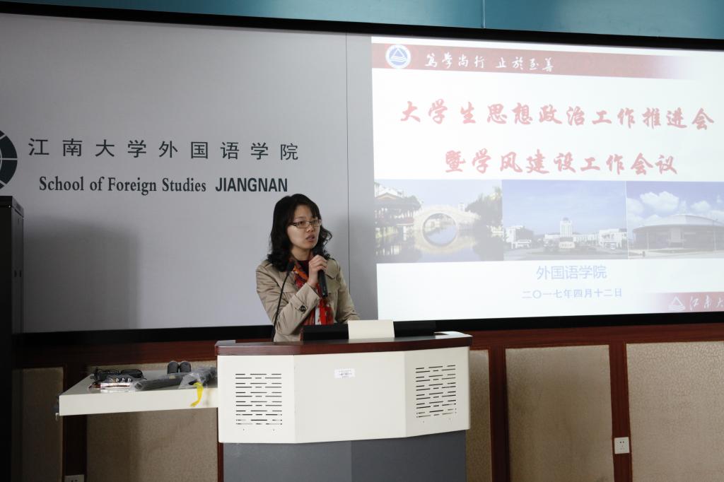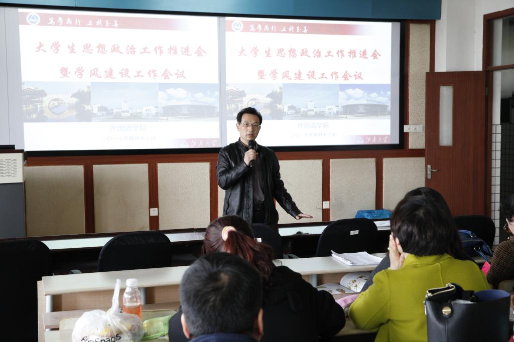 2017年4月12日下午,外國語學院召開了大學生思想政治工作推進會暨學風建設工作會議。院黨委書記黃城芳、各系部主任、全體輔導員、班主任等參加了此次會議。會議由黨委副書記趙瑩主持。