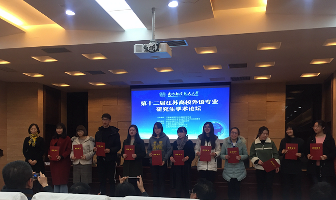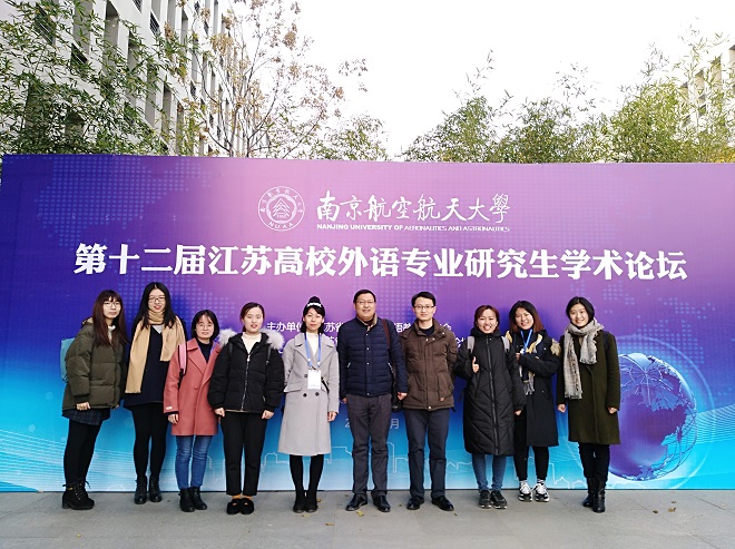 2017年12月8至10日,由江蘇省高等學校外語教學研究會和江蘇省高校外語專業研究生學術論壇組委會主辦,南京航空航天大學外國語學院承辦的第十二屆江蘇高校外語專業研究生學術論壇在南京航空航天大學舉行。省內高校160余名博士、碩士研究生及其領隊教師匯聚一堂,我院16級研究生馬小越、邱思佳、孫培培、王坤淼、謝婷婷、余婷婷、張芮和17級研究生潘婧在朱義華副院長的帶領下參加了此次論壇。