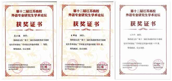 10日上午,我院6位同學參與了各自研究方向的小組匯報與討論,朱義華老師作為點評嘉賓參與了翻譯組的討論并對每位同學的匯報成果作了細致點評。小組討論結束后,參會代表在國際會議中心聆聽了南京師范大學辛斌教授所做的特邀報告。隨后舉行了本屆論壇的頒獎典禮與閉幕式,我院馬小越同學榮獲本屆研究生學術論壇優秀學術論文三等獎,孫培培同學和王坤淼同學獲得優勝獎,獲獎人數創歷史新高,為學校與學院爭得了榮譽。希望全體研究生今后更加努力鉆研,夯實語言基本功,提升科研水平,爭取更加優異的成績。