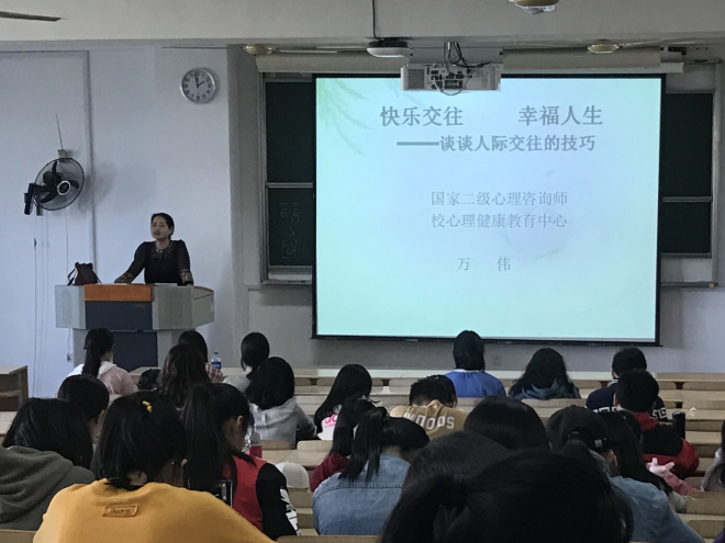2018年10月10日下午14點,一場主題為“快樂交往幸福人生——談人際交往的技巧”的心理講座在二教2D306如期舉行。本次心理講座由校心理健康中心專任教師、國家二級心理咨詢師萬偉老師擔任主講,外國語學院全體18級新生聆聽了講座。