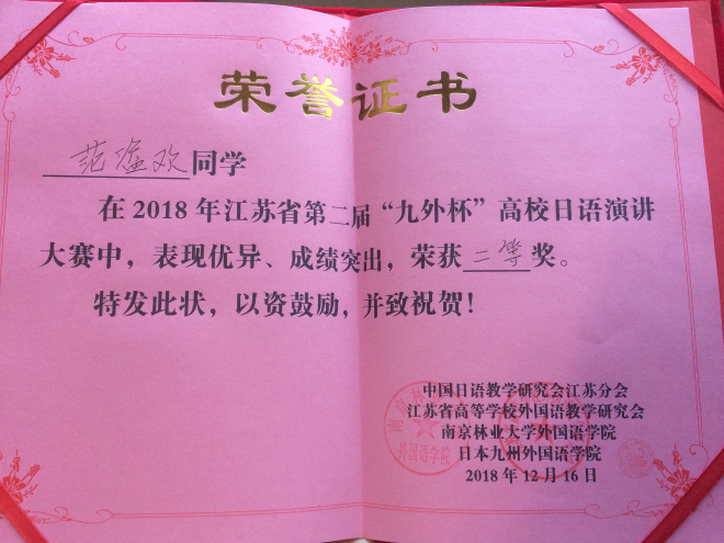 2018年12月16日,由中國日語教學研究會江蘇分會、江蘇省高校外語教學研究會和九州外國語學院聯合主辦的江蘇省第二屆“九外杯”高校日語演講大賽,在南京林業大學落下帷幕。參賽學子分別來自于南京大學、js3333線路檢測中心、東南大學、南京郵電大學、南京林業大學、安徽大學等32所高校。