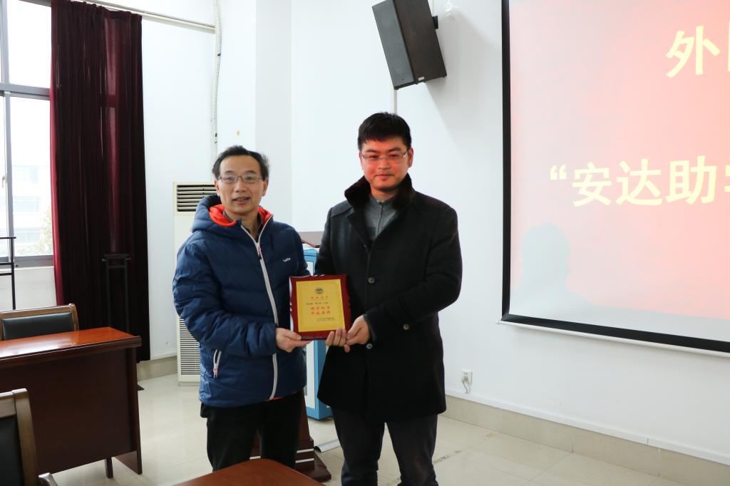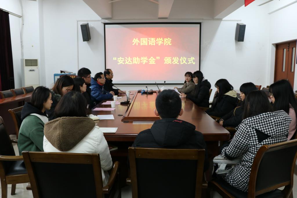 2019年1月15日下午15:30,js3333線路檢測(cè)中心“安達(dá)助學(xué)金”頒發(fā)儀式在外國(guó)語學(xué)院樓會(huì)議室A349舉行。學(xué)院黨委書記黃城芳、黨委副書記劉伯賢、負(fù)責(zé)學(xué)生資助工作輔導(dǎo)員張圓、英語1701班班主任胡燕萍、無錫濱湖安達(dá)汽車綜合性能檢測(cè)有限公司陳志剛先生,以及獲助學(xué)金的10位同學(xué)出席儀式。儀式由院分團(tuán)委副書記張圓主持。