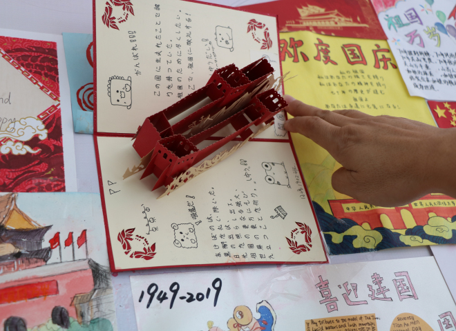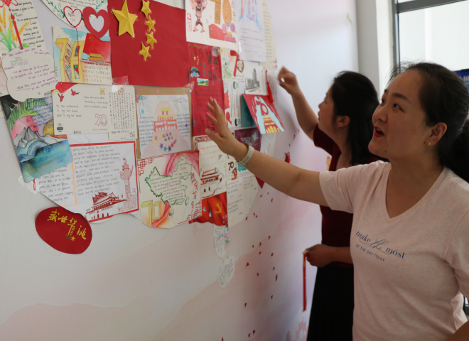寄語祖國手卡制作活動共收集來自研究生、本科生團支部120余份寄語收卡。9月28號下午,外國語學院學生會宣傳部的同學將收集的收卡制作寄語墻。中國的地圖像一只昂首傲立雄雞,“一唱雄雞天下白”,雄雞報曉送走了長夜,迎來了曙光,新中國七十年的風雨歷程和偉大成就激發(fā)青年學生愛國之情。為表達對祖國熱愛,外院學子將收集的寄語卡片制作成祖國地圖,以這幅嶄新的雄雞地圖寓意著中華民族的偉大復(fù)興不可阻擋。