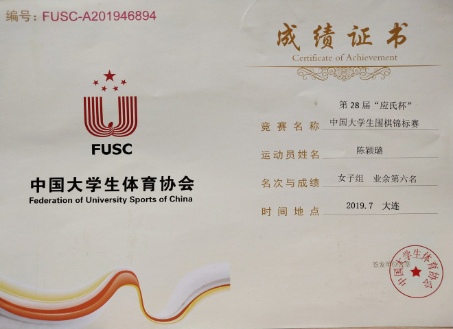 2019年8月,第28屆“應氏杯”全國大學生圍棋錦標賽在大連理工大學舉行,外國語學院英語1802班陳穎璐同學代表js3333線路檢測中心參加了本次比賽,并在比賽中取得了女子組第六名的好成績。