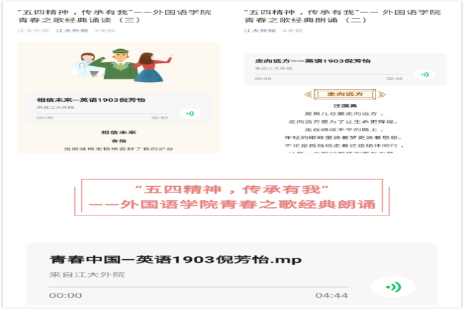 五四風雷,激蕩百年;五四精神,薪火相傳。五四期間,外國語學院利用學院微信公眾號推出三期青春之歌經典朗誦分享。第一期推出《青春中國》,第二期推出《走向遠方》、《山高路遠》,第三期推出《相信未來》、《熱愛生命》。通過誦讀經典,引導學生從經典中汲取精神力量,進一步加深對五四精神內涵的理解。
