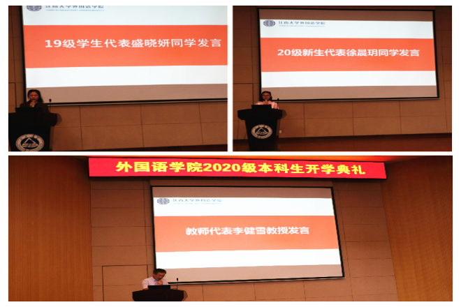 開學典禮開始前,參加典禮的師生進行現場測溫,并采取隔位的方式安排座位。大會在莊嚴的國歌聲中拉開帷幕。首先,由學院黨委書記史志洪致歡迎辭。史書記首先歡迎2020級新生加入外院大家庭,在談到如何過好大學生活時,史書記指出:大家要堅定理想信念,做好當下的學業規劃,在前行的路上不斷挑戰突破自己。之后,由教師代表李健雪教授發言。李教授主要分享了青年的學習狀態和青年人的理想,“樹立遠大理想,專業上科學學習方法,青春不留遺憾”引發了新生們的思考。在學生代表發言環節,19級學生代表盛曉妍同學用三組詞——人與眾、忙與閑、星空與大地給新生們提出了中肯的建議。20級新生徐晨玥同學代表全體新生站在新的起跑線上熱情發言,表達了對未來學習生活的憧憬。會議最后,院長方文開教授以“道”為切入點,為新生解讀了“篤學尚行,止于至善”的江大校訓,分別從為學、為世、為人三個方面給新生提出期望。最后方院長說:語言的學習要注重融合,在明確目標的基礎上要指定詳細的計劃,大學期間多讀經典著作。
