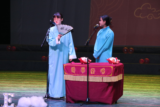 晚會開場由樂隊表演帶來《Don't cry》,氣氛熱烈,燃爆全場。隨后,晚會正式開始。學(xué)院英語系教師帶來的朗誦《起航》,表達了老師對學(xué)生的美好祝愿與期待;民族舞《煙雨麗人行》舞步優(yōu)美,極具中國風(fēng)的優(yōu)雅與端莊;相聲《新學(xué)外語》語言風(fēng)趣幽默,現(xiàn)場觀眾在相聲包袱中歡笑一片;英、日歌曲《Last Christmas+打上花火》,年輕富有朝氣的歌詞和曲風(fēng)點燃現(xiàn)場氣氛;院藝術(shù)團帶來的舞蹈《Kill this love》青春活力,展現(xiàn)了外院學(xué)子昂揚向上的風(fēng)貌;20級帶來的英文情景劇《Love story》融合當(dāng)下幽默喜劇元素,展現(xiàn)了20級新生極佳的創(chuàng)意;校藝術(shù)團帶來的走秀《Feelings》,活力四射,瞬間點燃全場同學(xué)的熱情;由田村恭平老師和吳丹凌帶來的器樂《糸》,為大家呈現(xiàn)了音樂盛宴;話劇《土撥鼠之日》輕松歡快,是專業(yè)與節(jié)目的有效融合;男舞《Doubtle knot+Bad guy》,熱情歡快的舞步洋溢著青春氣息;器樂《幻化成風(fēng)》美妙動聽;幕布情景劇《就這Young!》以新穎的方式呈現(xiàn)校園青春故事,現(xiàn)場觀眾沉浸在幕布劇營造的氛圍中;最后外院學(xué)生會為大家?guī)泶蠛铣断矚g你》,晚會在熱烈的氣氛中圓滿結(jié)束。