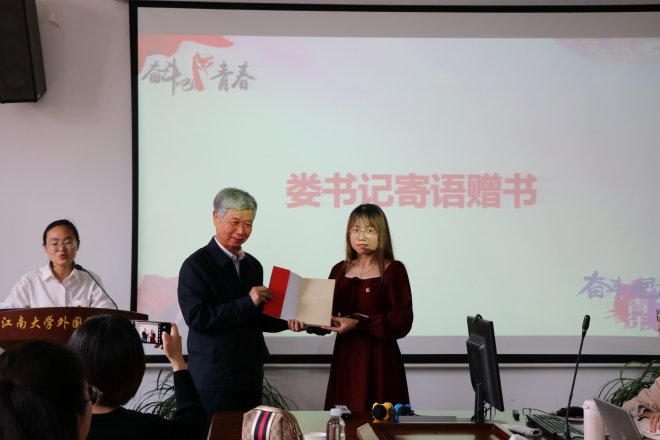 最后由婁國(guó)棟老師分享了自己的入黨初心和故事。婁國(guó)棟老師自1973年3月5日入黨,工作期間與青年為友,全心致力于學(xué)生工作。他強(qiáng)調(diào)了青年人的時(shí)代責(zé)任與歷史使命,青年大學(xué)生要重視大學(xué)時(shí)期,將自己的初心和使命體現(xiàn)在日常的學(xué)習(xí)生活中。婁國(guó)棟老師說(shuō):本次團(tuán)課可以激發(fā)學(xué)生們的內(nèi)在動(dòng)力,發(fā)展自我,奉獻(xiàn)自我,發(fā)揮青年人的作用?!扒啻菏侨松詈玫碾A段,青春的精神應(yīng)永遠(yuǎn)保留,青春萬(wàn)歲!”最后,婁國(guó)棟老師向英語(yǔ)1904團(tuán)支部贈(zèng)書《習(xí)近平的七年知青歲月》,讓時(shí)代青年感受習(xí)近平總書記青春時(shí)代的力量。
