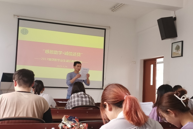 為充分發揮資助育人功效,培養畢業生誠實守信、知恩感恩的良好品質,結合學校《關于開展2021年js3333線路檢測中心學生資助誠信教育主題活動的通知》《關于開展國家開發銀行生源地信用助學貸款2021屆畢業生畢業確認工作的相關通知》的相關精神和要求,保證生源地信用助學貸款持續健康發展,引導大學生樹立誠實守信的文明新風,5月24日下午1:30外國語學院在A433召開貸款畢業生誠信教育大會。畢業年級全體貸款學生參與了此次大會,會議由輔導員苗文建主持。