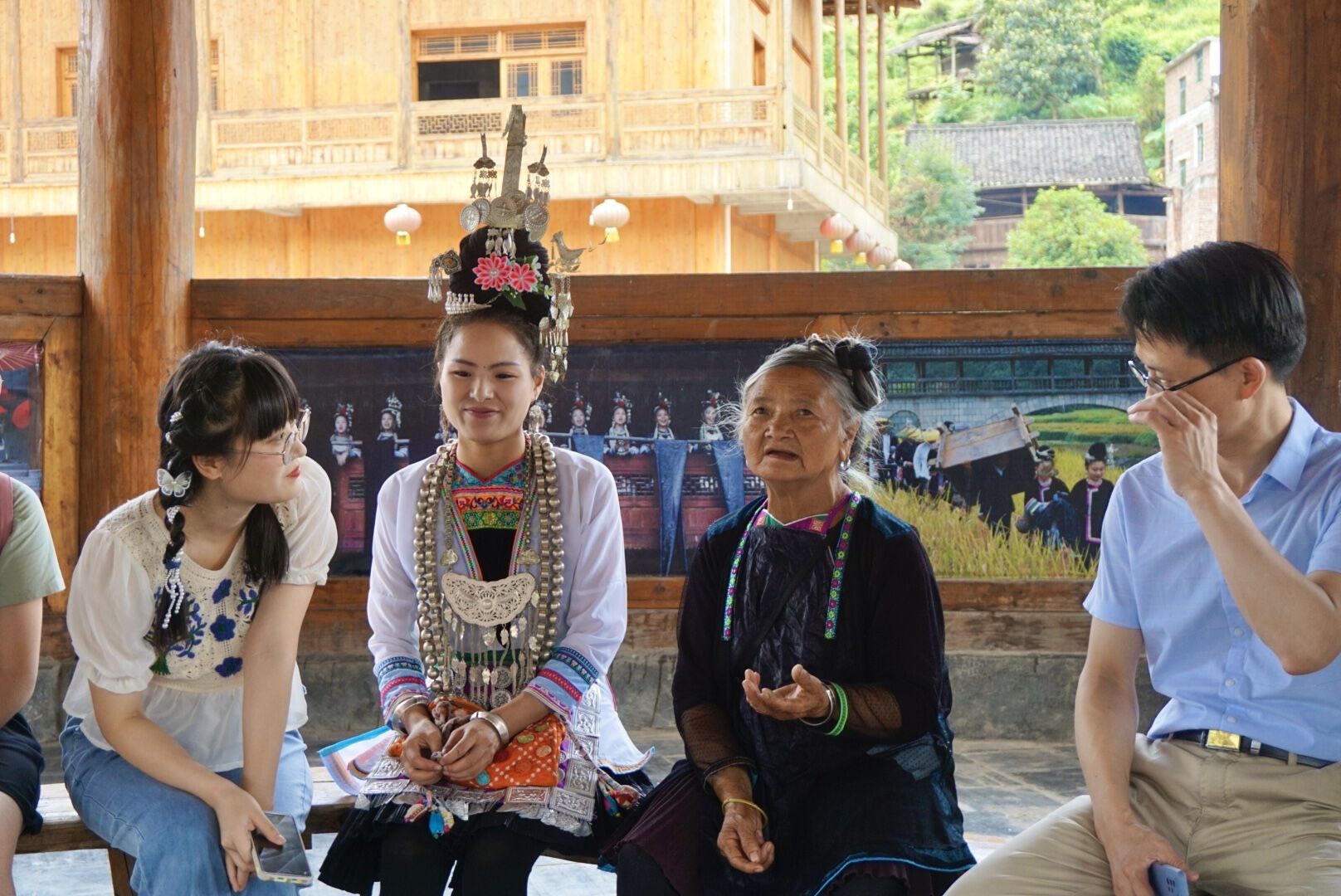 侗歌聲悠揚,翻譯助傳承。侗族大歌是聯合國教科文組織列入的人類非物質文化遺產,為更好地推動《侗族大歌志》英文翻譯工作,助力侗族大歌保護與傳承,實踐團成員赴貴州省從江縣開展翻譯調研采風活動。7月16日上午,“譯見中情”育人工作室實踐團在育人工作室負責人朱義華副院長的帶領下同從江縣周惠林副縣長帶隊的縣政府相關部門開展侗族大歌文化交流座談會,雙方就侗族大歌翻譯與傳播的現狀與難點進行了深刻的討論。第二日,實踐團成員前往高增鄉小黃村采訪潘薩銀花、賈福英兩位國家級非物質文化遺產傳承人,跟著兩位傳承人學習、體驗侗族大歌,并一同欣賞了侗族大歌表演,親身體會侗族千年文化的獨特魅力,為后續侗歌翻譯工作的推進奠定了認知與專業基礎。