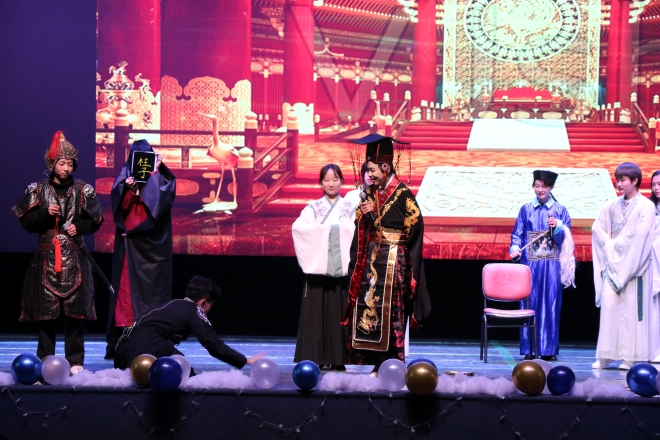 晚會由拳擊貓樂隊表演的《On my own》開場,氣氛熱烈,燃爆全場。第一篇章在民舞《書簡》的翩若驚鴻中正式開始。日語歌《Lemon in the summertime》勾起了我們對夏日時光的回憶;話劇《荊軻刺秦王》由外院藝術團表演,他們將英語融入歷史背景,幽默詼諧的風格讓觀眾笑聲連連;日語配音《哆啦A夢》在帶我們重溫經典的同時,感受到了日語配音的魅力。