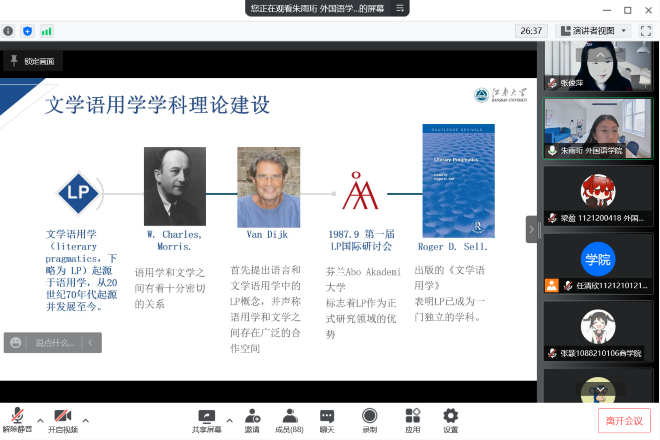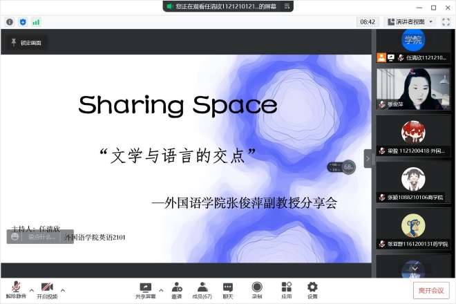 “Sharing Space分享空間”是外國語學院學生會在新文科、新外語背景下,旨在為廣大外院學子搭建學術、技能等信息分享交流平臺。3月26日14時,“Sharing Space分享空間”邀請外國語學院張俊萍副教授線上參與主講“文學與語言學的交點”主題圓桌會,會議吸引近百名同學參與線上交流。