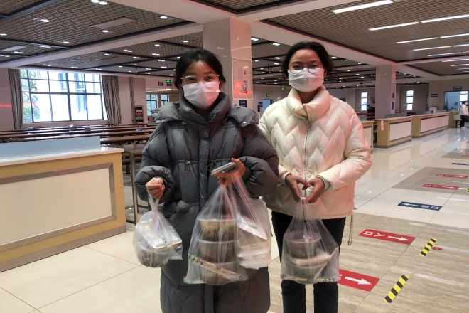 對(duì)于宿舍限動(dòng)的同學(xué),學(xué)院及時(shí)安排志愿者進(jìn)行“點(diǎn)對(duì)點(diǎn)”服務(wù)。每個(gè)限動(dòng)的宿舍安排一名志愿者對(duì)接,除了日常送餐外,及時(shí)了解限動(dòng)宿舍的人員晨午檢情況。為了給宿舍限動(dòng)同學(xué)送餐,志愿者們每天跑多次食堂,細(xì)心地了解同學(xué)們的口味愛好,挑選美味的飯菜,給限動(dòng)同學(xué)們稍顯單調(diào)的生活帶來了絲絲暖意。一句“放心,隨叫隨到哈”,讓宿舍限動(dòng)的同學(xué)感受到暖心的關(guān)懷。病毒讓人和人之間的距離變遠(yuǎn),但卻拉近了心與心之間距離。在疫情這一特殊時(shí)期,同學(xué)們互幫互助,一起共渡難關(guān)。
