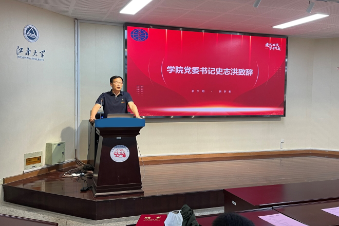開學典禮開始前,22級新生通過觀看《遇見·外院》宣傳片對學院有了進一步的了解。開學典禮在莊嚴的國歌聲中拉開帷幕。首先,學院黨委書記史志洪致歡迎辭。史志洪首先歡迎2022級新生加入外院大家庭,在談到如何過好大學生活時,他提出三點希望:第一,要志存高遠,做有底氣的人;第二,要好學力行,做有朝氣的人;第三,要挑戰自我,做有勇氣的人。史志洪強調:青春是人生中最美好的年華,大學是人生中最重要的階段,大家要在江大外院跑出青春的最好成績。