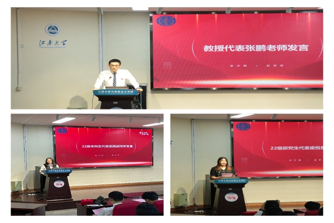 在新生代表發言環節,圣雨涵同學代表本科新生站在新的起跑線上熱情發言,表達了對未來學習生活的憧憬,分享了自己的大學規劃。22級研究生代表梁悅思則分享來到江大外院的喜悅,代表研究生表達了對學術研究的不懈追求。兩位同學都強調了踐行“篤學尚行,止于至善”校訓的重要性。