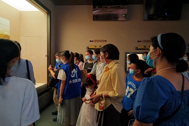 下午1時,青協志愿者頂著高溫,在博物館門口組織學生簽到。入館后,新生們紛紛合影留念,興奮溢于言表。在館內,講解員與同學們一同探索無錫的“前世今生”。從原始時期的馬家浜文化、崧澤文化和良渚文化到春秋戰國時期的吳越之地;從唐宋時期江南的農產豐收富饒到明清之際無錫商業經濟發展。