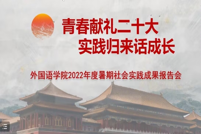 喜迎二十大,奮進新征程。10月5日下午,外國語學院2022年暑期社會實踐成果報告會通過騰訊會議順利舉行。外國語學院分團委書記陸芳、輔導員顧海星、苗文建出席會議,學生會主席團成員、21級和22級全體學生全程參與本次會議。