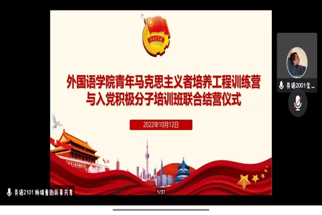 10月12日下午,外國(guó)語(yǔ)學(xué)院2022年度青年馬克思主義者培養(yǎng)工程訓(xùn)練營(yíng)暨入黨積極分子培訓(xùn)班結(jié)營(yíng)儀式通過(guò)騰訊會(huì)議順利舉行。學(xué)院黨委副書(shū)記劉伯賢、分團(tuán)委書(shū)記陸芳出席會(huì)議,全體營(yíng)員參加了此次會(huì)議。