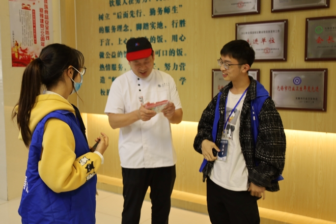 下午1時,青協志愿者在四食堂集合,為食堂的工作人員發放聲音感謝信與暖手寶,表達對其日復一日辛勤工作的感激之情。聲音感謝信上面附有二維碼,由同學們的祝福音頻壓縮轉碼而成,掃描即可聽取祝福。聽到祝福后,食堂工作人員深表感動。