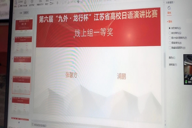 此次因疫情原因,我校選手通過線上參加比賽。比賽分為命題演講和即興演講兩部分。我校選手日語系2001班張馨方同學才思敏捷、沉著冷靜,最終憑借扎實的日語基礎和豐富的知識儲備,以第一名的好成績獲得一等獎;中西由美子老師和吳穎老師獲得優秀指導獎。