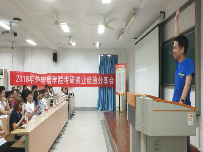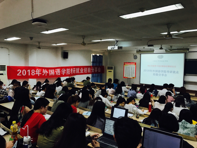 2018年外國語學院考研就業經驗分享會于5月23日晚在2D308舉行。院分團委書記楊艷、輔導員張圓、黃穎出席本次活動,10位優秀應屆畢業生作為分享嘉賓來到現場,15級全體學生及16級、17級部分學生參加了分享會,會場座無虛席。