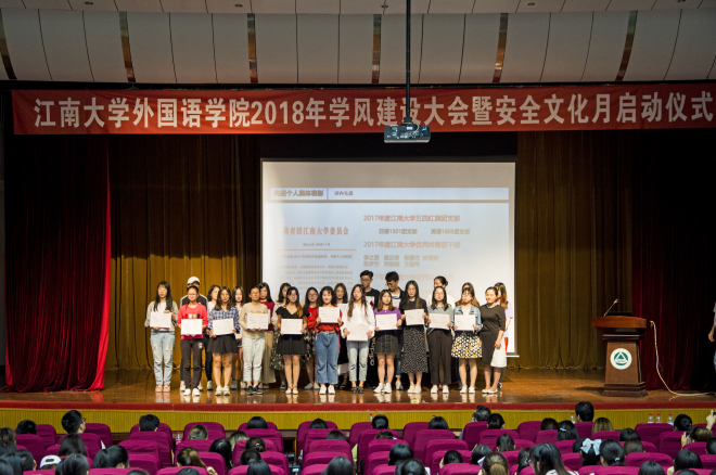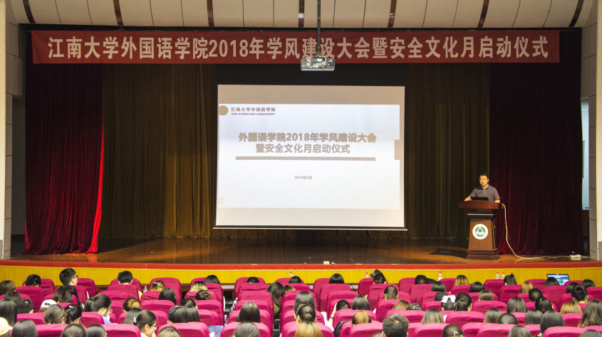 外國語學院2018年學風建設大會暨安全文化月啟動儀式于5月31日晚在南活報告廳如期舉行。校學工處副處長汪雙喜、院黨委書記黃城芳、分團委書記楊艷、輔導員張圓、黃穎以及15級、16級、17級全體學生到場參加,大會由院黨委副書記劉伯賢主持召開。