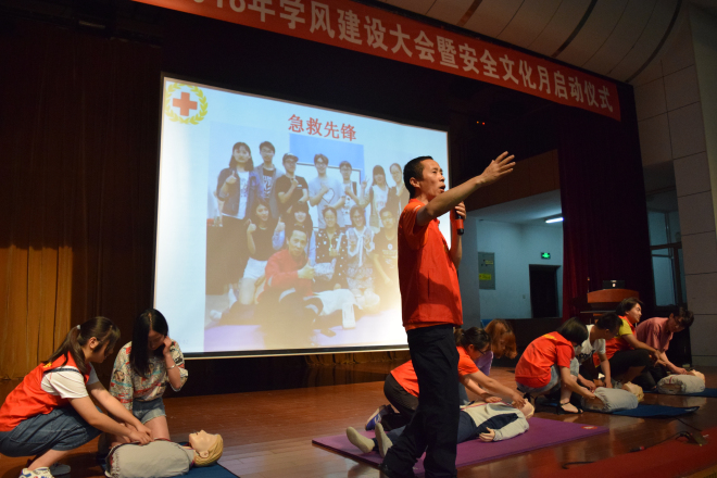 大會結束后由張圓老師主持進行了安全文化月的第一個活動——應急救護培訓。活動邀請了無錫市急救中心的兩位老師,他們激情澎湃地向在座師生介紹了稱為“生命五環(huán)”的成人心血管急救生存鏈和成人急救CPR流程,并邀請在場同學參與演示。