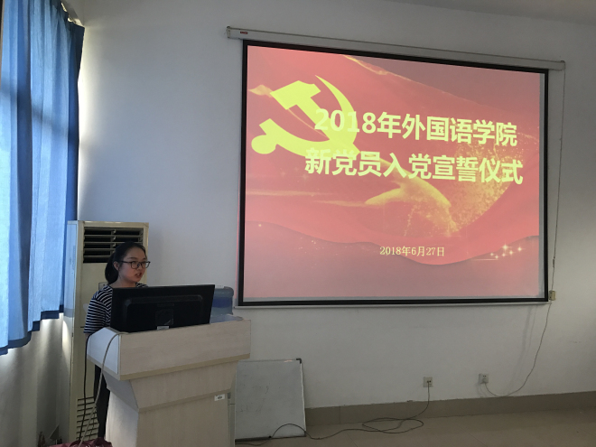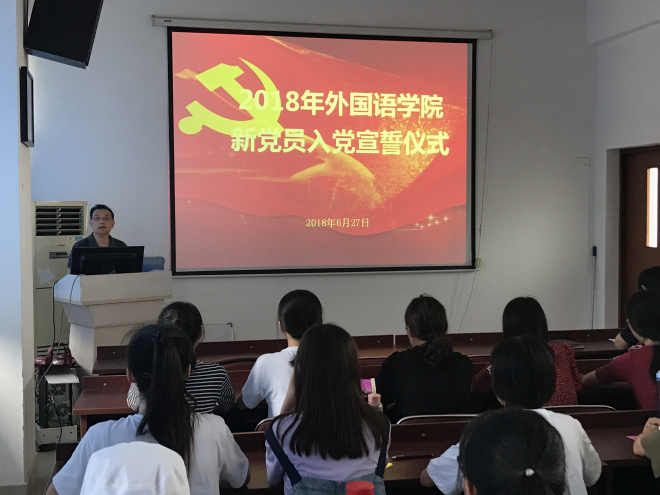 2018年6月27日下午,外國語學院在A433舉行2018年新黨員入黨宣誓儀式。參加本次入黨宣誓儀式的有院黨委書記黃城芳、黨委秘書許廣玉、分團委書記楊艷、輔導員張圓、黃穎以及2018年全體新黨員,儀式由楊艷主持。