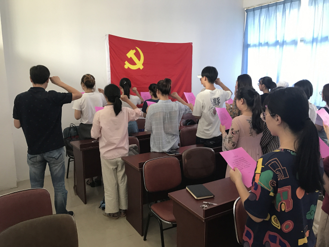 儀式開始,全體起立奏唱《國際歌》。接著,楊艷老師宣讀了本次新發展的黨員名單,許廣玉老師帶領全體新黨員宣誓。新黨員代表方潔同志發言,她表示每位新入黨的同志都要實現入黨誓詞,不斷加強對黨的基本理論和黨的知識的學習,不斷加強黨性修養,不斷自我學習、自我提高、自我完善,永遠保持黨員先進性,提高業務水平和技能,以優異的成績向黨和社會匯報,做合格的中國共產黨黨員。