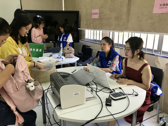 2018年8月29日上午七點半,外國語學院新生報到工作也迎著朝陽順利開展。正如外國語學院樓外懸掛的橫幅所寫:“英姿勃發,日漸成才;欲立鴻鵠志,外院助你成”,外國語學院的迎新工作也是如此。報到處分三組迎接來自的新生:確認錄入新生報到信息、分發新生材料、回答新生與家長們對新學校學習生活的疑惑等。同時設置了綠色通道,為無法按時交清學費的同學辦理相關手續,幫助其順利入學。盡管天氣炎熱,但院學生會和青協志愿者們熱情不減,耐心、細致、周到地為新生及家長提供服務,各個環節都有條不紊地進行著。