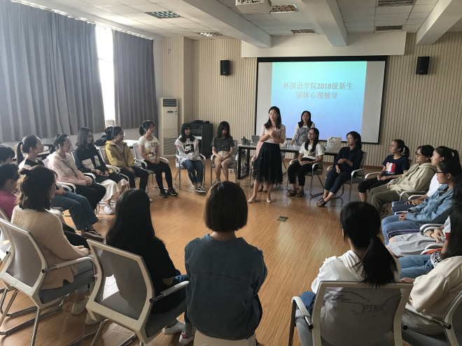 2018年9月26日下午3點半,外國語學院2018級新生團體心理輔導活動于學院A529舉行,學校心理健康中心兼職教師、人文學院輔導員張慧、外國語學院心理輔導員張圓、18級新生輔導員黃穎、各班心理保健委員和學生代表參與了本次活動,本次團體心理輔導的主體為“快樂你我他——大學生壓力與情緒管理”。