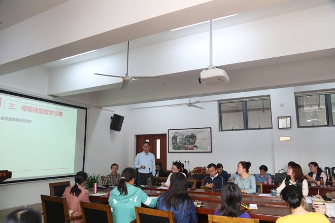 龔院長指出改革應(yīng)立足師生雙主(教師為主導(dǎo),學(xué)生為主體),以學(xué)生發(fā)展為中心,引導(dǎo)學(xué)生主動學(xué)習(xí),提高學(xué)習(xí)效率和自主學(xué)習(xí)能力。在課堂上,教師的角色要實現(xiàn)從授業(yè)向解惑的轉(zhuǎn)變、教學(xué)方法應(yīng)實現(xiàn)由演繹向歸納的轉(zhuǎn)變、教學(xué)內(nèi)容要實現(xiàn)由扁平向縱深的轉(zhuǎn)變。同時,大外的教師團(tuán)隊組織形式也可借鑒英語專業(yè)的實踐模式,實施輪換制,即每個教學(xué)班級配備不同學(xué)科背景的師資力量輪流承擔(dān)部分教學(xué)任務(wù),最大程度共享優(yōu)質(zhì)教學(xué)資源。在條件許可下,甚至可以和國際教育學(xué)院等部門合作,充分利用外教和留學(xué)生資源,嘗試中外教師合作教學(xué)。在談及聽力、閱讀等輸入型課程教學(xué)方式改革時,提出了零課時教學(xué)模式,倡導(dǎo)通過泛在化教學(xué),引導(dǎo)學(xué)生通過自主學(xué)習(xí),完成規(guī)定量的學(xué)習(xí)內(nèi)容。最后,龔院長總結(jié)說改革的最終目的是要讓學(xué)生忙起來,要讓學(xué)生有的放矢地學(xué)習(xí),改革應(yīng)以點及面推開,是理念的更新,更是實踐的自然選擇。最后,龔院長對本學(xué)期各課程的考核模式提出了指導(dǎo)性建議。