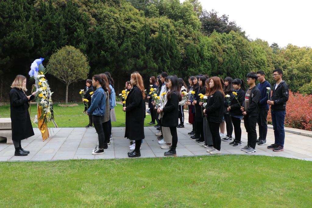 祭掃儀式由竇新華副處長主持。竇老師向大家介紹了榮副主席的生平事跡及榮氏家族對js3333線路檢測中心的支持和捐贈。榮副主席生前熱愛祖國,心系家鄉,心系教育事業,同時不忘支持js3333線路檢測中心發展。隨后,由學生代表莊重地向陵墓敬獻了花籃。英語1705班的蔡艷娟同學作為學生代表誦讀祭文,表達了對榮副主席的高風亮節、豐功偉績、家國情結以及其崇高品格的追思與敬重,并表示我們應刻苦鉆研,自覺將自己的命運同國家的命運緊密結合在一起。活動最后,參加祭掃的同學和老師們向陵墓鞠躬并靜默哀思三分鐘,結束后繞墓地一周并獻上鮮花,表達對榮副主席及夫人的深切哀悼和敬仰。