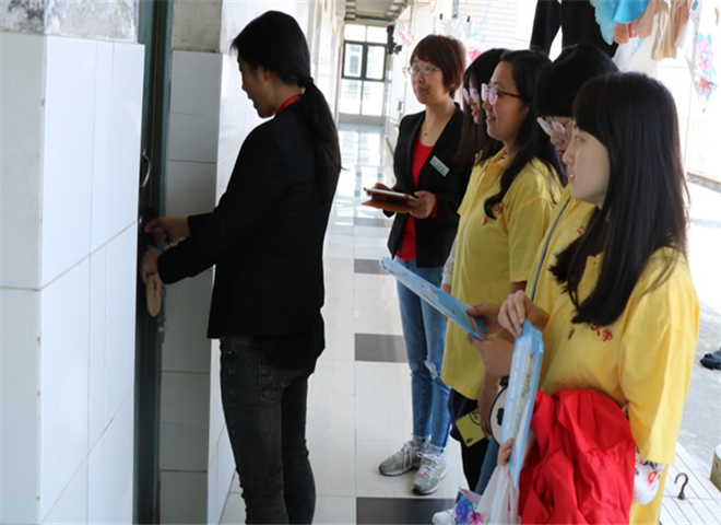 志愿者配合站長老師進行宿舍衛(wèi)生督查、發(fā)放“掃黑除惡”宣傳單