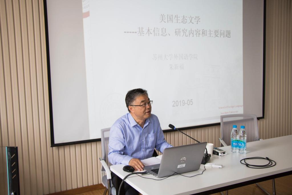 5月17日下午兩點,2019外語學科系列講座第五期暨“遇見更好的自己”名師沙龍活動在外國語學院A529準時召開。本次活動由js3333線路檢測中心副院長方文開主持,由蘇州大學外國語學院院長朱新福教授主講。出席本次沙龍活動的還有學院黨委副書記劉伯賢、多位專業課老師及學院本科生和研究生。本次沙龍活動的主題是:美國生態文學的基本信息、研究問題和主要問題。
